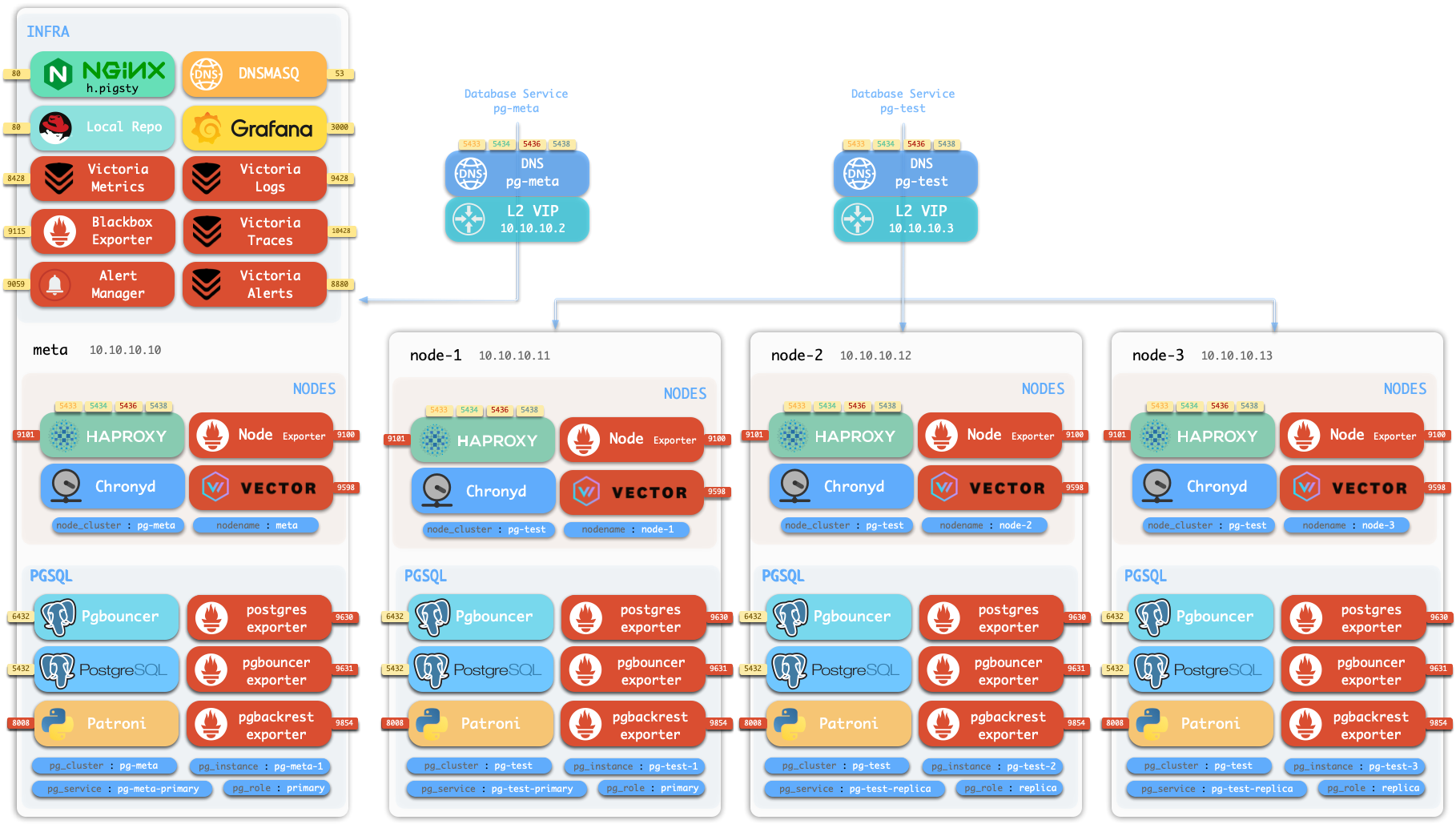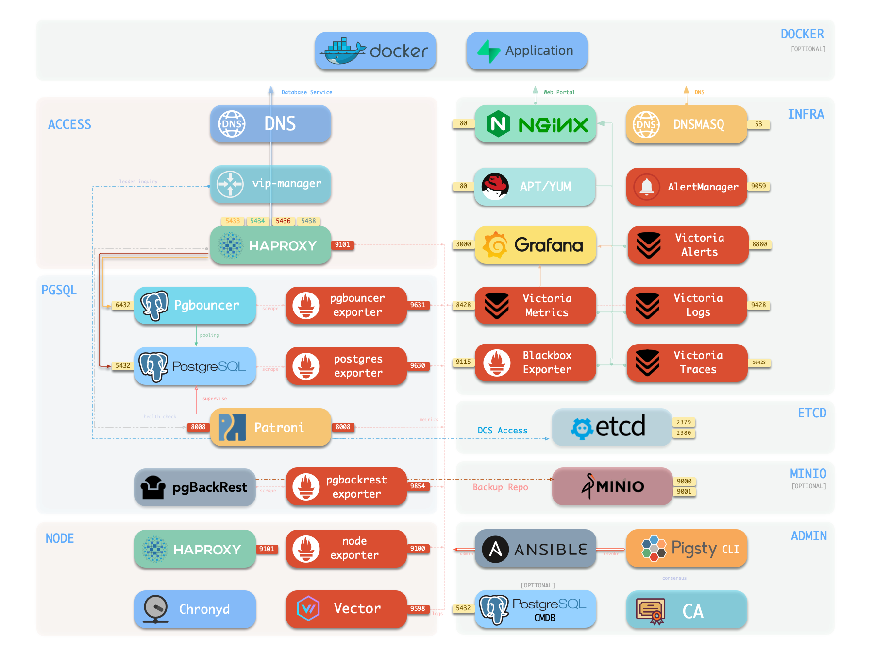 - Availability: Deliver stable, reliable, auto-routed, transaction-pooled, read-write separated high-performance database services, with flexible access modes via HAProxy, Pgbouncer, and VIP.