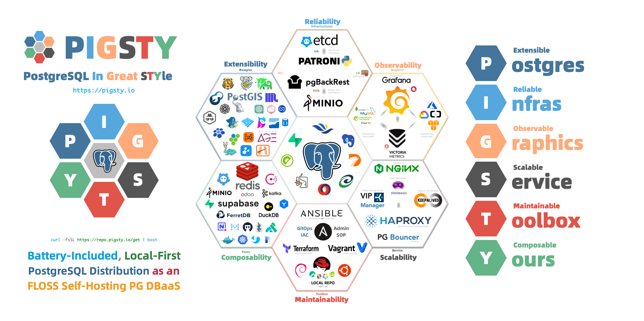 - Composability: Modular architecture design, reusable Infra, various optional modules: Redis, MinIO, ETCD, FerretDB, DuckDB, Docker, Supabase.