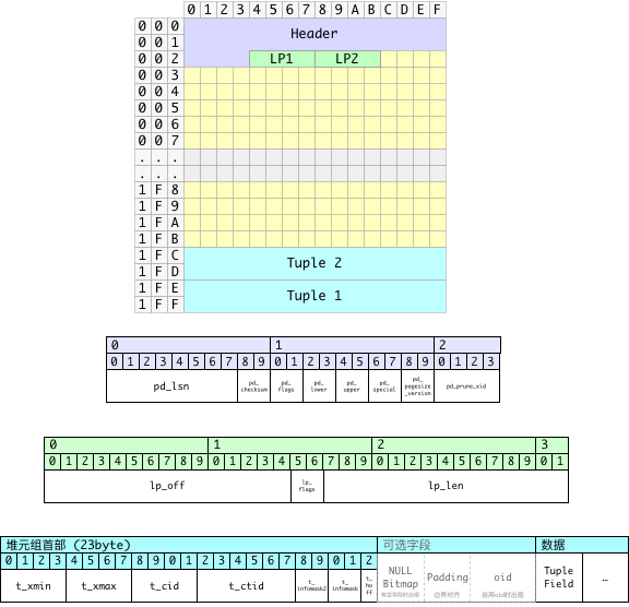 • 如果表启用了WITH OIDS选项,元组还会有一个4字节的OID,但这里我们不考虑该情况。