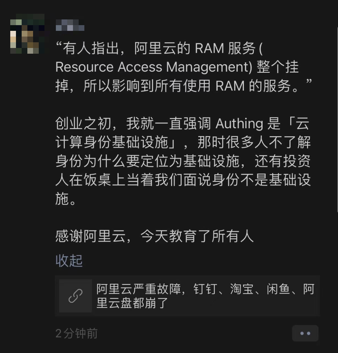 尽管阿里云至今仍未给出一份事后故障复盘报告,但老司机根据爆炸半径,就足以判断出问题在哪里了 —— Auth (认证 / 鉴权 / RAM)。