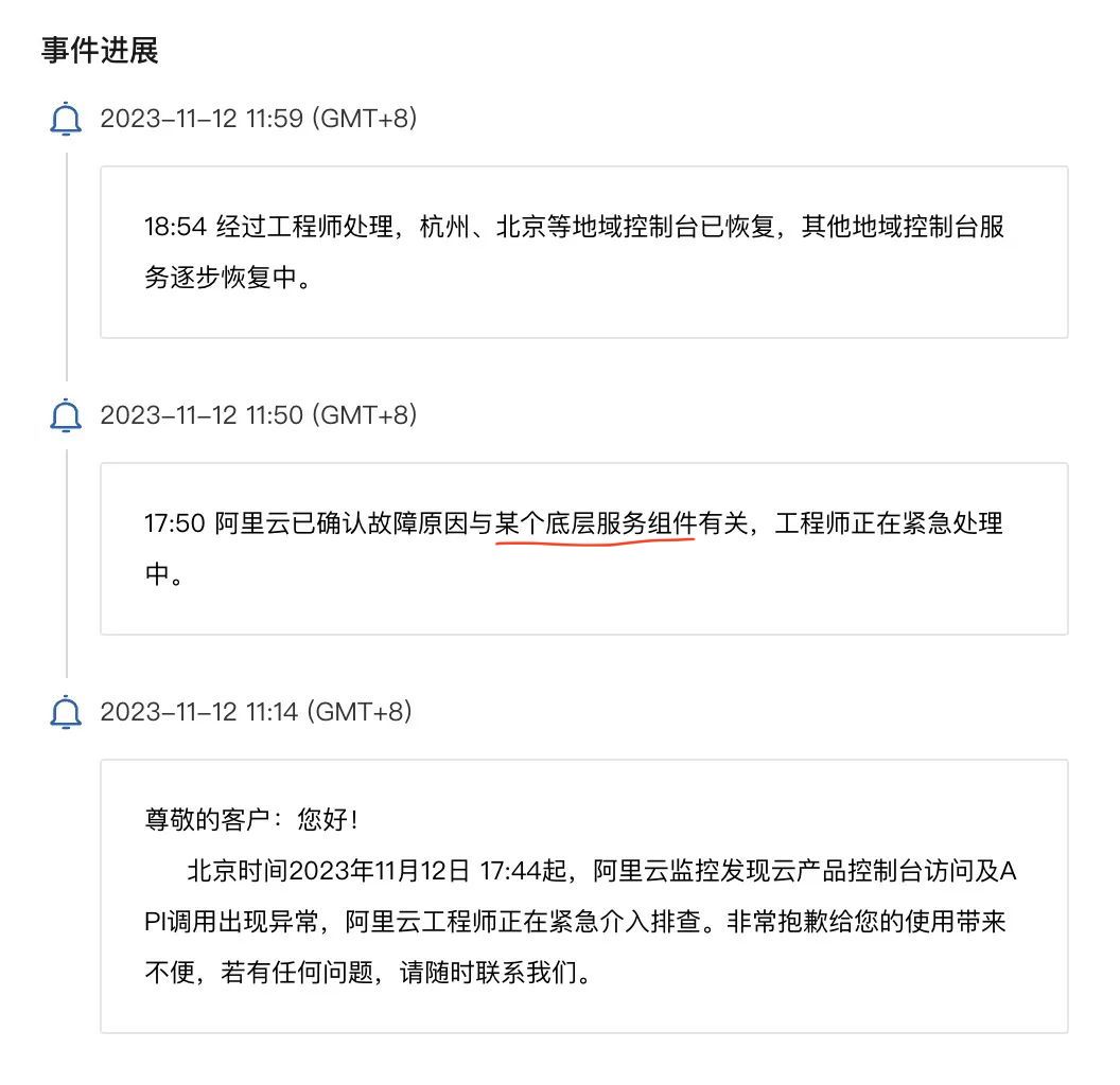 阿里云的事件进展公告:出问题的是某个底层服务组件,而不是网络、机房硬件的问题。