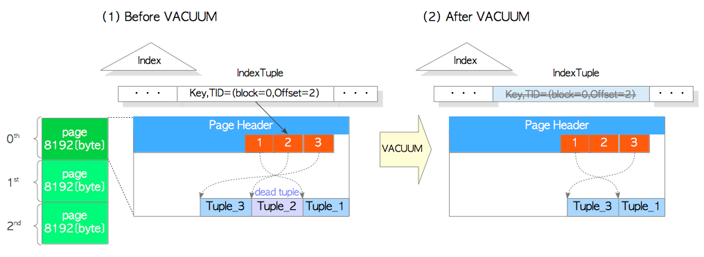 请注意,非必需的行指针是不会被移除的,它们会在将来被重用。因为如果移除了行指针,就必须同时更新所有相关索引中的索引元组。