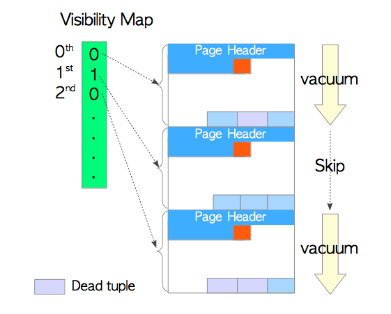 VM的基本概念很简单。 每个表都拥有各自的可见性映射,用于保存表文件中每个页面的可见性。 页面的可见性确定了每个页面是否包含死元组。清理过程可以跳过没有死元组的页面。