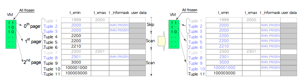 图6.6给出了一个例子。 根据VM中的信息,冻结此表时会跳过第0页。在更新完1号页面后,相关的VM信息会被更新,因为该页中所有的元组都已经被冻结了。