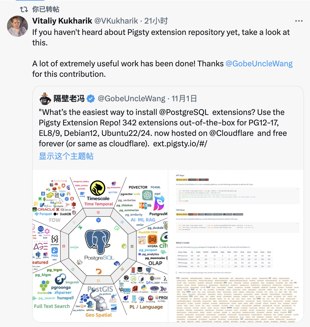有的时候这种模式挺管用,比如去年当我发现 pgvector 这个强力向量数据库扩展还没有二进制软件包制成品时,我第一时间提给 Devrim , 将其放入 PGDG 仓库,然后 pgvector 遂成为 PG 生态中的向量数据库事实标准,进入到各家云厂商 RDS 中。
