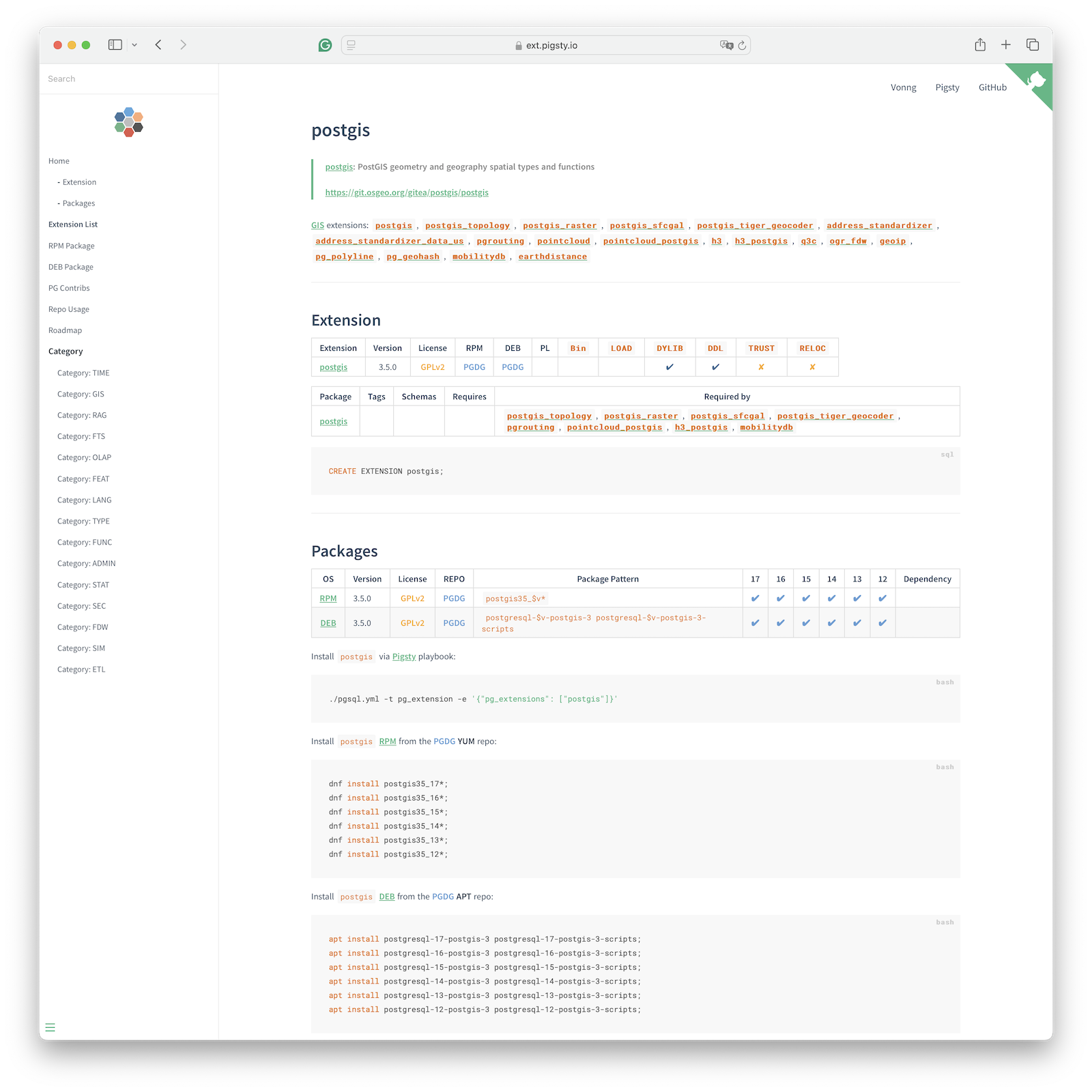 | Entry / Filter | All | PGDG | PIGSTY | CONTRIB | MISC | MISS | PG17 | PG16 | PG15 | PG14 | PG13 | PG12 |