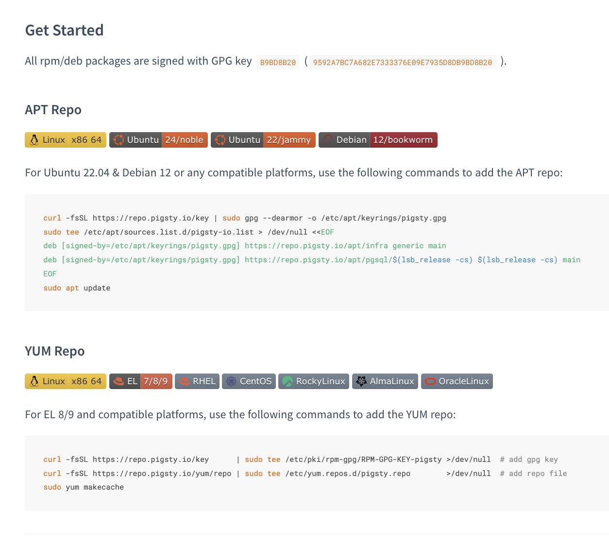 当然题外话是广告时间,安装这些扩展,使用这个仓库的最简单的方式是什么?当然是开箱即用的 PostgreSQL 数据库发行版 —— Pigsty —— 但这并非必选项。 你依然可以用简单的一行 shell 在任何 EL/Debian/Ubuntu 系统上启用此仓库。