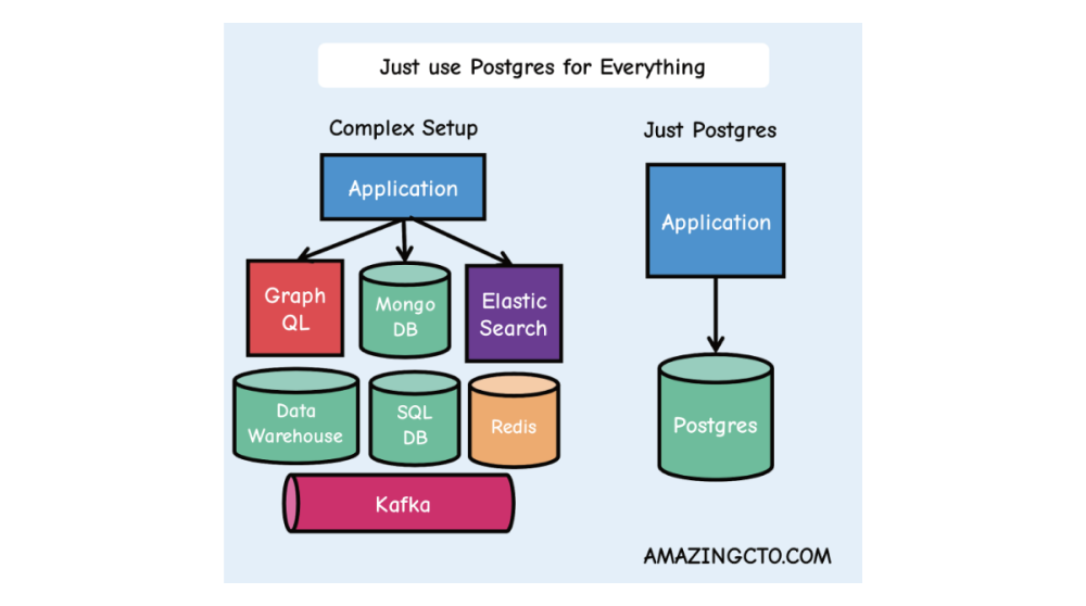 在初创公司中简化技术栈、减少组件、加快开发速度、降低风险并提供更多功能特性的方法之一就是**“一切皆用 Postgres”**。Postgres 能够取代许多后端技术,包括 Kafka、RabbitMQ、ElasticSearch,Mongo和 Redis ,至少到数百万用户时都毫无问题。
