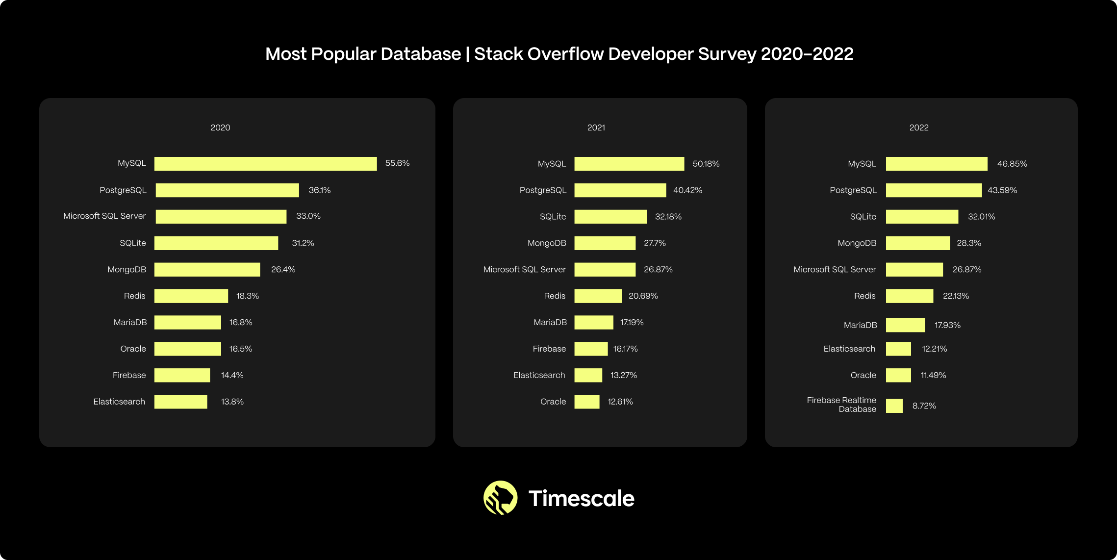 在 2020 ~ 2022 年间,根据 StackOverflow 的开发者调查显示,PostgreSQL 是第二受欢迎的数据库,其使用率持续上升。来源: 2020,2021,2022。