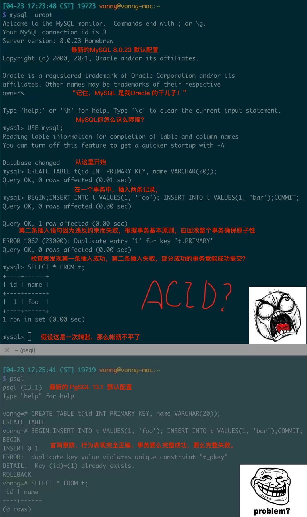 当然,滑稽的是还有一些MySQL用户将其称为“特性”,说这体现了MySQL的容错性。实际上,此类“特殊容错”需求在SQL标准中完全可以通过SAVEPOINT机制实现。PgSQL对此的实现就堪称典范,psql客户端允许通过ON_ERROR_ROLLBACK选项,隐式地在每条语句后创建SAVEPOINT,并在语句失败后自动ROLLBACK TO SAVEPOINT,以标准SQL的方式,以客户端可选项的形式,在不破坏事物ACID的情况下,同样实现这种看上去便利实则苟且的功能。相比之下,MySQL的这种所谓“特性”是以直接在服务端默认牺牲事务ACID为代价的(这意味着用户使用JDBC,psycopg等应用驱动也照样受此影响)。