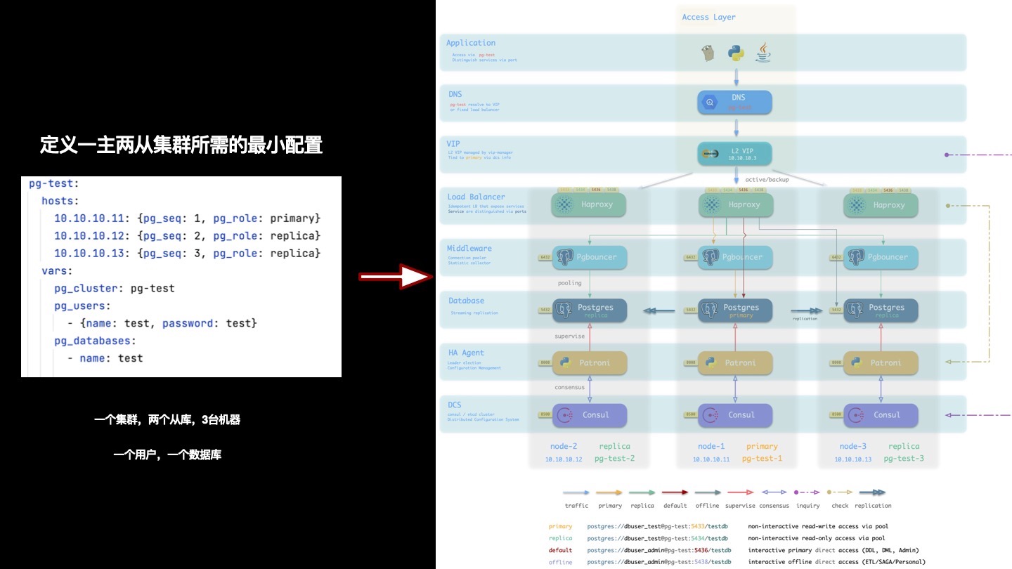 Pigsty吸纳了Kubernetes架构设计中的精髓,采用声明式的配置方式与幂等的操作剧本。用户只需要描述“自己想要什么样的数据库”,而无需关心Pigsty如何去创建它,修改它。Pigsty会根据用户的配置文件清单,在几分钟内从裸机节点上创造出所需的数据库集群。
