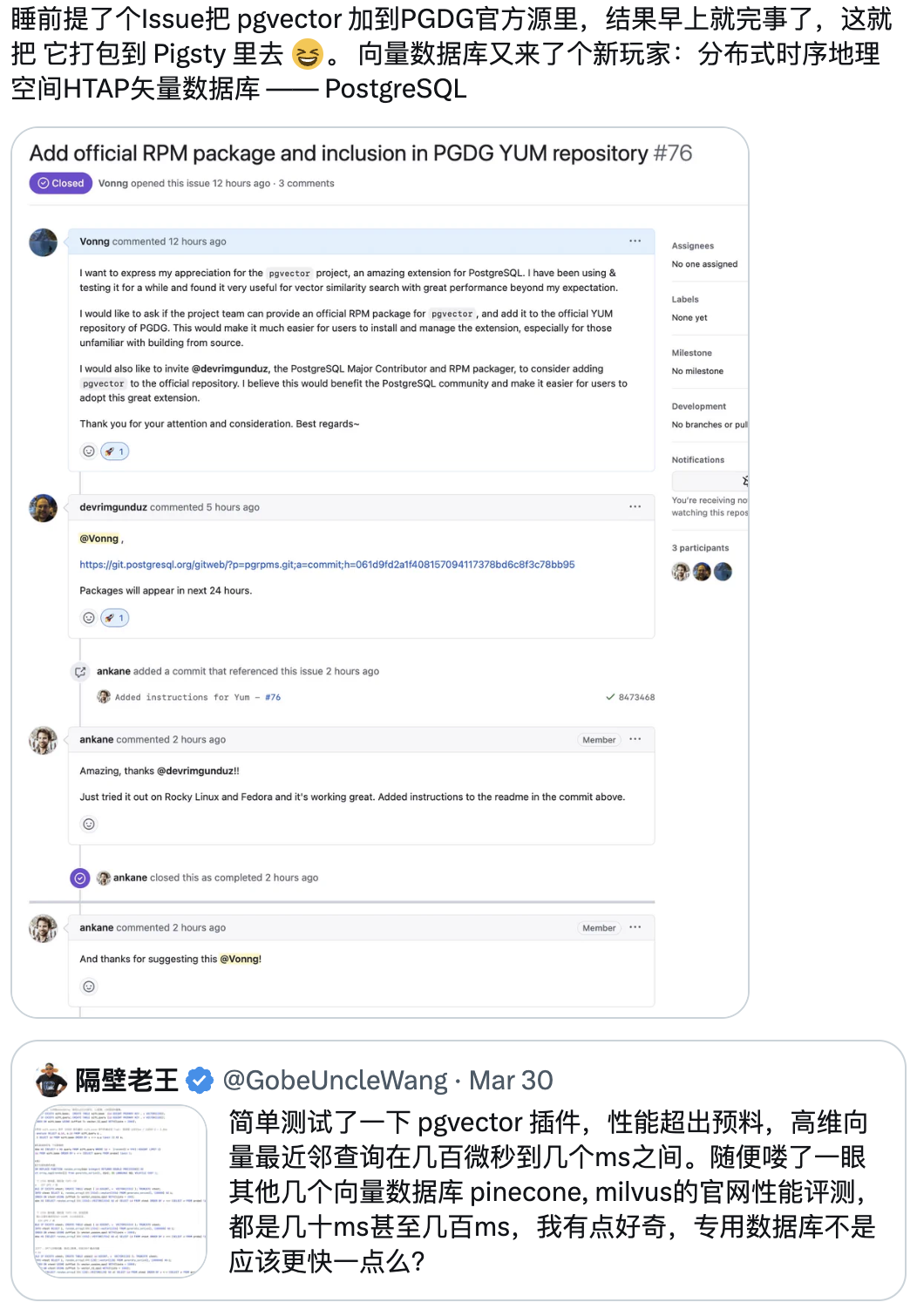 我们将 pgvector 提入 PostgreSQL PGDG 官方源,正式成为 PG向量扩展的事实标准;我们进行性能评测,引发了推上关于 PGVector 的大讨论;而我们所维护的开箱即用的开源 RDS PG 替代 Pigsty,则是第一波将 pgvector 集成整合提供服务的 PostgreSQL 发行版。